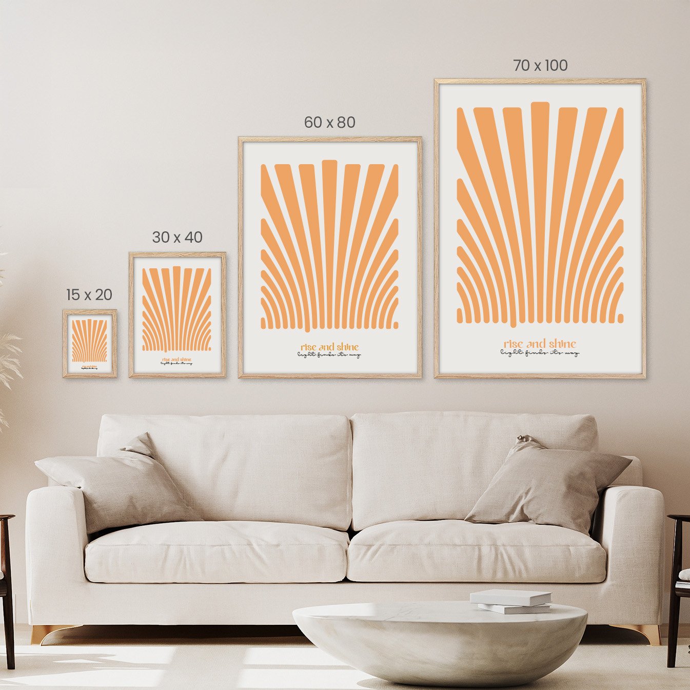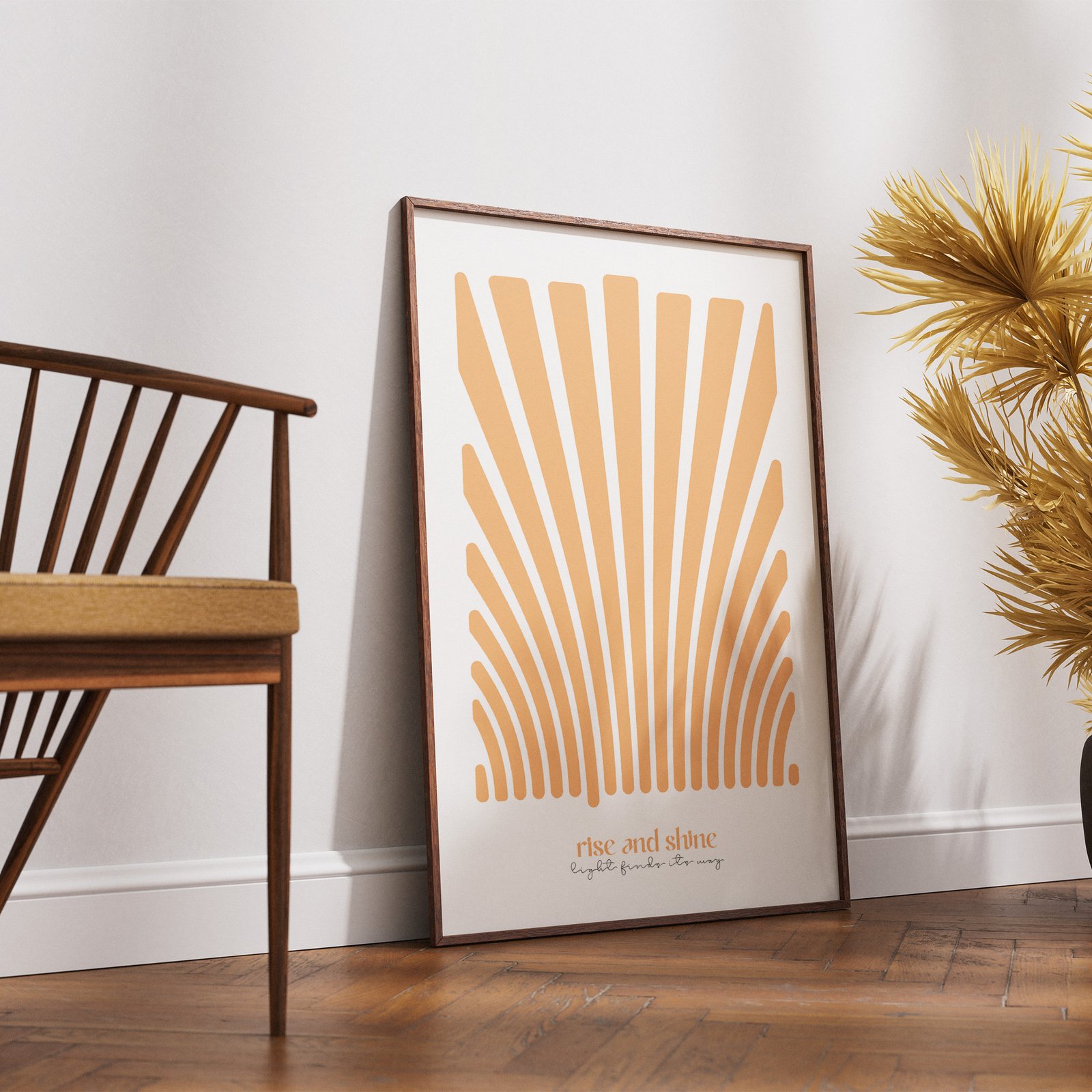 Rise and Shine Poster – Dieses minimalistische Kunstwerk symbolisiert den Beginn eines neuen Tages und die Kraft, sich dem Licht zuzuwenden. Die harmonisch angeordneten, strahlenförmigen Linien erinnern an die wärmende Morgensonne, die mit Zuversicht und Energie den Tag erhellt. Die Botschaft „Rise and Shine“ wird ergänzt durch die Subline „light finds its way“, die uns daran erinnert, dass selbst im Dunkeln immer ein Weg ins Licht existiert. Perfekt für alle, die Motivation und Positivität in ihren Räumen verankern möchten.
